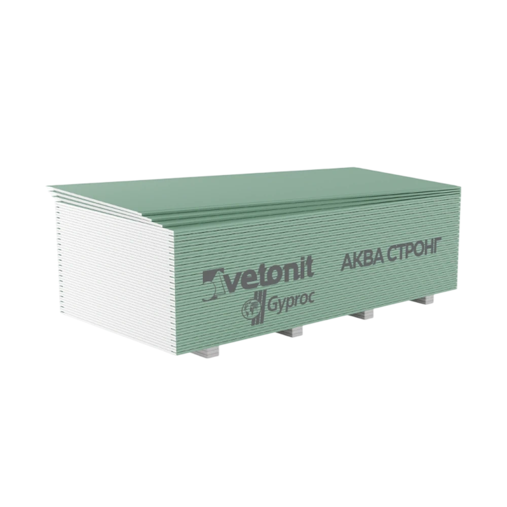 Vetonit Gyproc Аква Стронг 1950х1200х15 мм — высокопрочный влагостойкий лист для усиленных перегородок, стен и потолков. Подходит для внутренних работ и последующей отделки. Источник характеристик линейки: https://www.gyproc.ru/produkciya/gipsovye-stroitelnye-plity/gsp-vetonit-gyproc-akva-strong-prochnyy