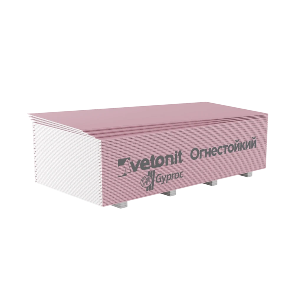 Vetonit Gyproc Огнестойкий 2500х1200х12,5 мм — огнестойкий гипсокартон для перегородок, потолков и облицовок с требованиями по пожарной безопасности. Подходит для внутренних работ и последующей отделки. Источник характеристик линейки: https://www.gyproc.ru/produkciya/gipsovye-stroitelnye-plity/gsp-vetonit-gyproc-ognestoykiy-2500kh1200kh125-mm