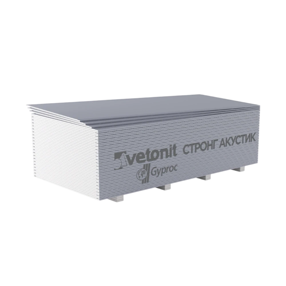 Vetonit Gyproc Стронг Акустик 2500х1200х15 мм — высокопрочный акустический лист для перегородок, стен и потолков с улучшенной звукоизоляцией. Подходит для внутренних работ и последующей отделки. Источник характеристик линейки: https://www.gyproc.ru/produkciya/gipsovye-stroitelnye-plity/gsp-gyproc-strong-akustik-15-mm-2500kh1200