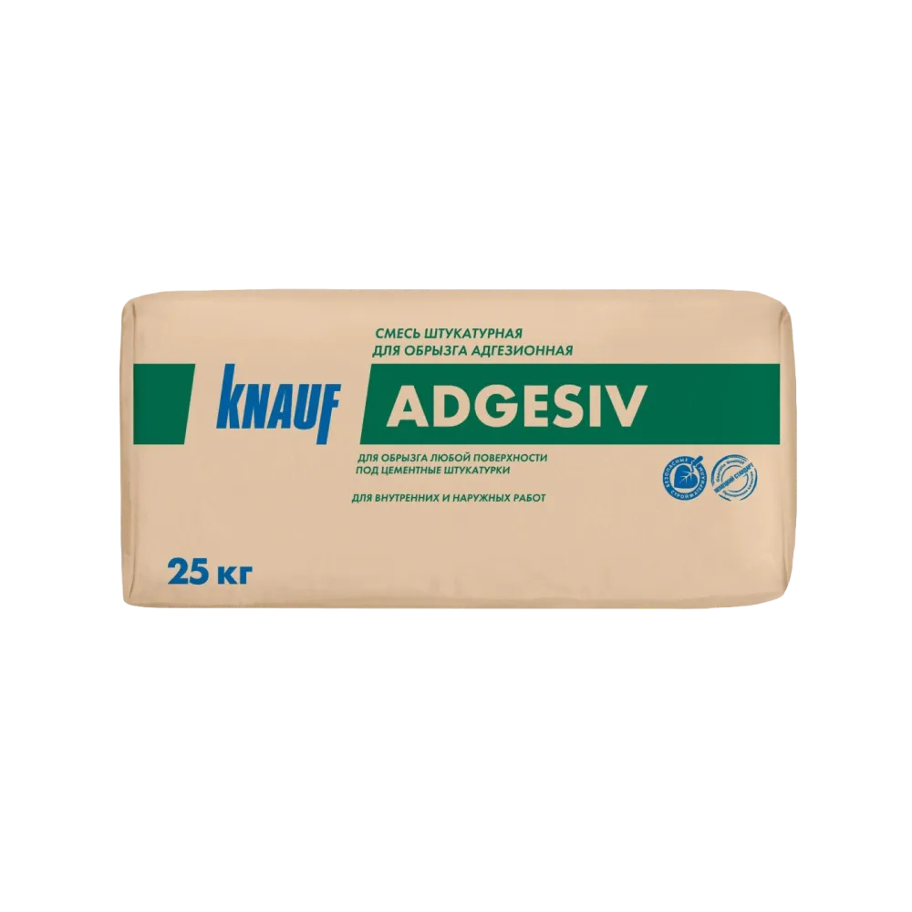 - Штукатурка цементная для обрызга адгезионная КНАУФ-Адгезив создает шероховатую высокоадгезионную поверхность
